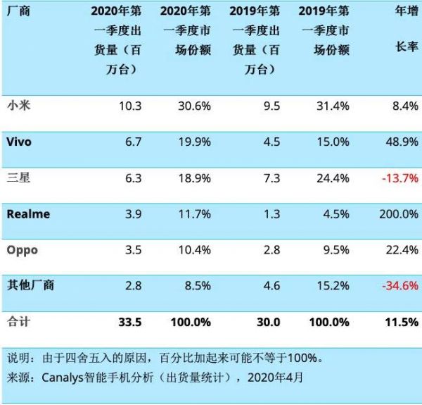 印度排名前五的智能手机品牌中,有四个(小米、vivo、OPPO、Realme)来自中国。根据Canalys发布的数据,2020年第一季度,四个中国品牌的出货量,占到了印度智能手机市场近73%的份额。排名第三的三星占18.9%的出货量,是前五名中唯一一家非中国品牌。