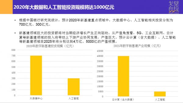 2020年是一个数字新基建的元年,2020年的大数据和人工智能的投资规模将达到1000亿元人民币。根据中国银行的研究院统计,预计2020年新基建重点领域中大数据中心、人工智能相关投资分别为700亿元和300亿元。新基建领域巨大的投资额将对当前经济增长产生正向驱动,从产值角度讲5G、工业互联网、云计算等新基建领域的投入将带动上下游产业链协同发展,产值巨大,预计云计算、大数据、人工智能等新基建领域在2025年分别达到4万亿和5000亿的产值规模。大家可以看到这个数字是非常巨大的,当然这是一个从业人员的研究和期许吧。但是我相信随着国家对新基建领域的投入,包括现在数字化、智能化的发展,这些预期我相信很大概率是能够实现的。