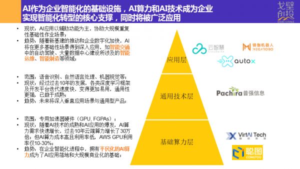 上层应用层。AI应用是以辅助功能为主,协助大规模重复性基础性作业场景。随着新基建的推动和企业数字化加快,AI将在更多基础性场景得到深入运营。比如智能交通中的自动驾驶,包括大量数据中心建设所涉及的智能运维、智能制造等领域。