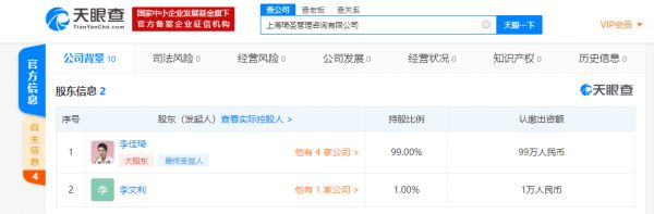 天眼查数据显示,上海琦圣管理咨询有限公司成立于2019年6月,注册资本100万人民币,法定代表人为李文利,公司经营范围包括企业管理咨询,经济信息咨询,商务咨询等。其中,李佳琦为该公司最大股东,持股比例99%;李文利为第二大股东,持股比例1%。