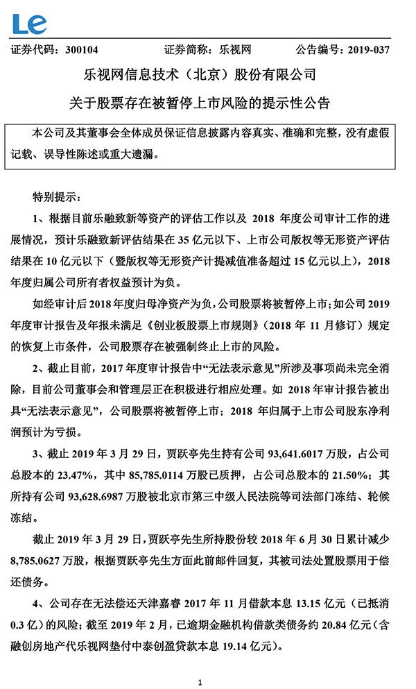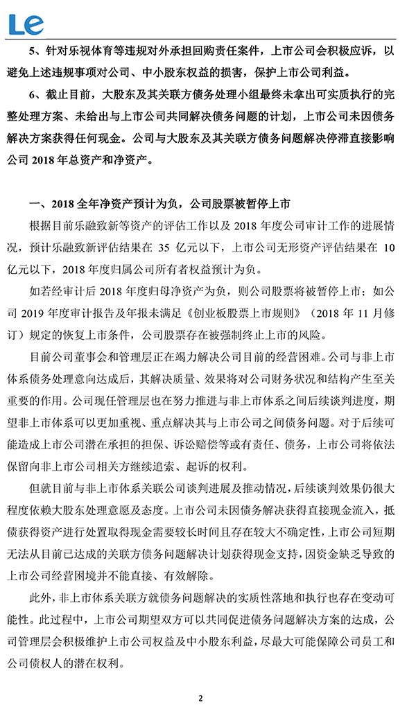 乐视网表示,如经审计后2018年度归母净资产为负,公司股票将被暂停上市;如公司2019年度审计报告及年报未满足《创业板股票上市规则》(2018年11月修订)规定的恢复上市条件,公司股票存在被强制终止上市的风险。