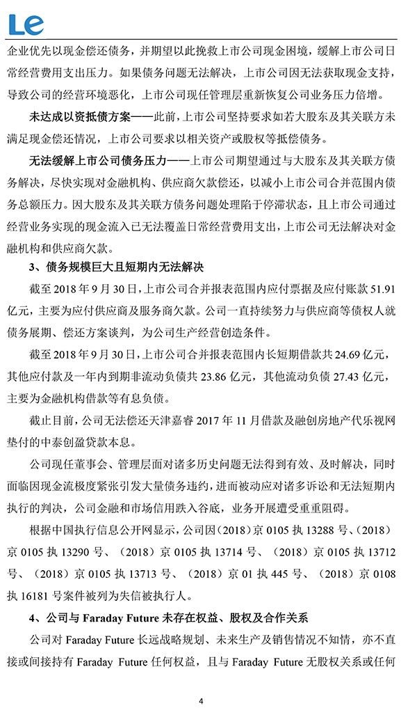 乐视网表示,截至目前,大股东贾跃亭及其关联方债务处理小组最终未拿出可实质执行的完整处理方案,未给出与上市公司共同解决债务问题的计划,上市公司未因债务解决方案获得任何现金,公司与大股东及其关联方债务问题解决停滞直接影响公司2018年总资产和净资产。