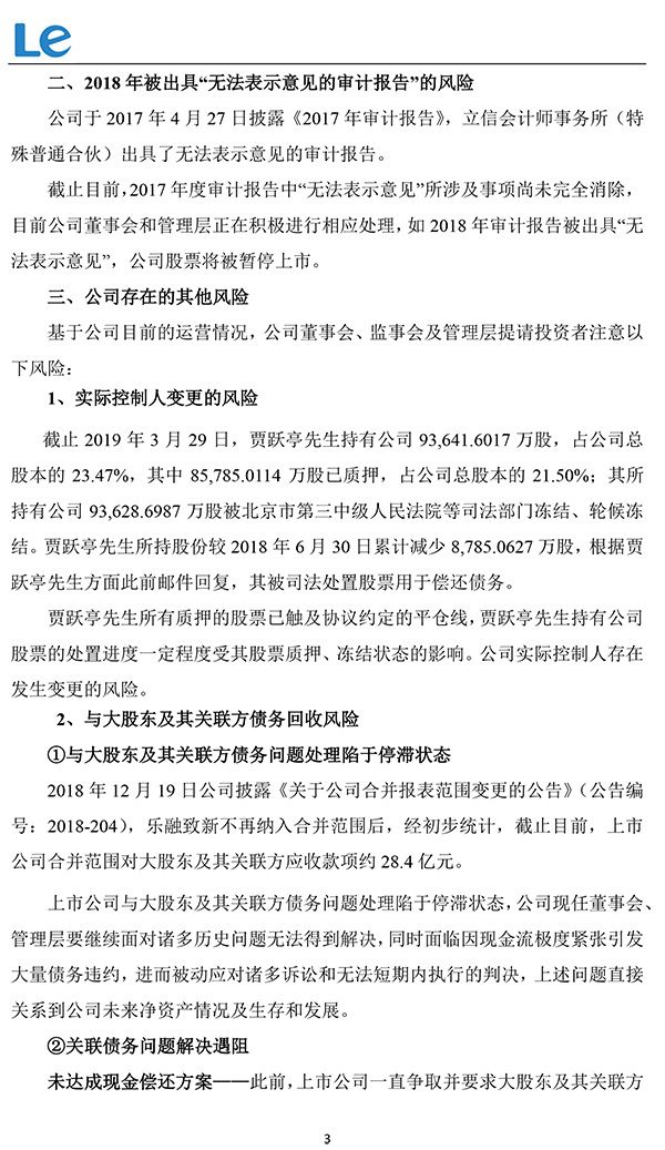 可能导致乐视网暂停上市的另一因素是,乐视网2017年度审计报告中“无法表示意见”所涉及事项尚未完全消除,如2018年审计报告被出具“无法表示意见”,公司股票将被暂停上市。