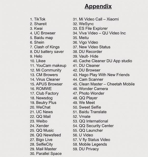 @界面【印度以“安全”为由禁用59款中国App,包括TikTok、微信和UC浏览器】综合《印度快报》《印度斯坦时报》《今日印度》等印媒29日晚消息,印度信息技术部宣布已禁用59种中国应用。这些App包括抖音国际版TikTok、茄子快传、UC浏览器、微信、QQ、快手和美图等,涵盖各类用户和用途。