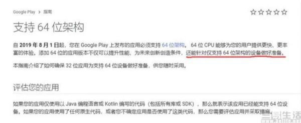 当时我们曾指出,Android的64位应用不能及时实现替代的主要原因,其实谷歌对于开发者的“纵容”要负很大一部分责任。因为按照当时的官方开发指南来看,虽然其在2019年8月1日(这已经很晚了)起,就已经明确规定了所有在官方商店上架的应用必须支持64位,但却没有禁止保留对32位的兼容。