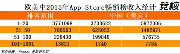 去年年中市场调研机构Newzoo曾做过一次大范围的手游收入统计,覆盖了欧洲、美国和中国三个地区App Store畅销榜近千款游戏的单月收入。