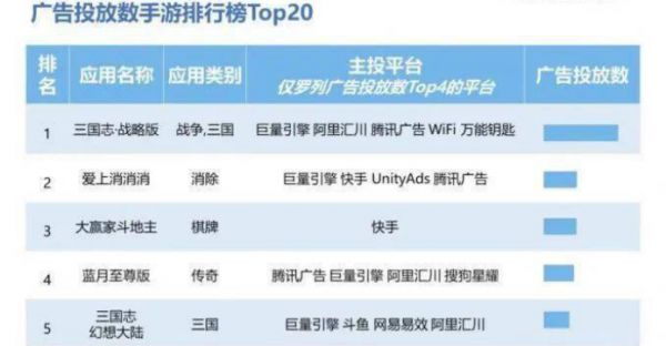 根据六月份App Growing发布的《2020年5月份手游买量市场分析》显示,5月《三国志战略版》在广告投放数方面遥遥领先,比起第二名《天天爱消除》多出一倍还多。