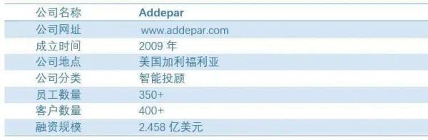 成立于2009年的Addepar是一家面向财富管理公司的大数据技术服务供应商,为财富管理公司提供资产数据的汇总、筛选、分析、报告生成等服务,以流畅、透明、高效的数据处理技术获得了众多客户的青睐。目前,平台共拥有超过400家的企业客户,包括金融集团Morgan Stanley、家族财富管理公司CAMCapital、私人银行Jefferies等。平台帮助客户管理了1.7亿美元资产。2020年,Addepar被福布斯评为全球金融科技公司前50强。