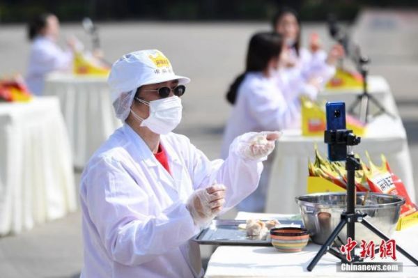 资料图:一位工人直播包“辣条馅”的饺子。中新社记者 杨华峰 摄