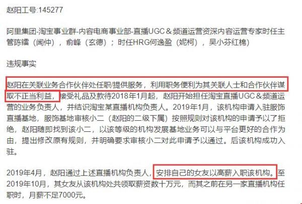 6月29日,21世纪经济报道等媒体报道称,原淘宝直播UGC&频道资深运营专家赵阳因贪污被阿里巴巴内网通报,并贴出了阿里巴巴内网廉政公告全文。