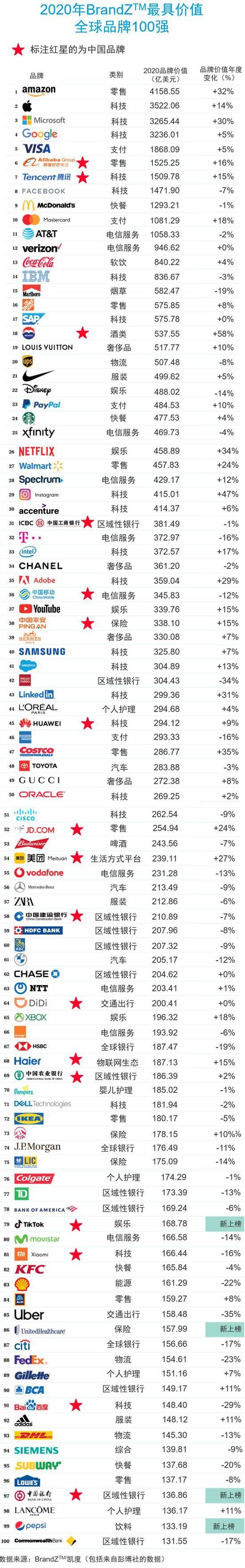 2020年BrandZ最具价值全球品牌100强 完整榜单视频