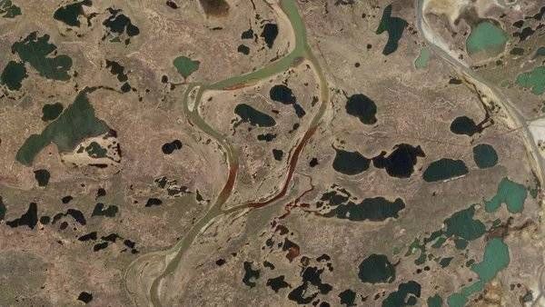 卫星图像显示,由于永久冻土融化,巨大的燃料罐坍塌,导致诺里尔斯克的油泄露流入周边河流。来源:Contains modified Copernicus Sentinel data 2020