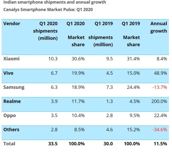 市场研究机构Canalys易观的数据显示,2020年一季度,印度智能手机市场出货量整体上升了11.5%,在出货量前5的手机品牌中,有4个品牌来自中国。小米依旧牢牢占据市场第一的份额,一季度出货量为1030万部,市场占比30.6%,同比增长8.4%。