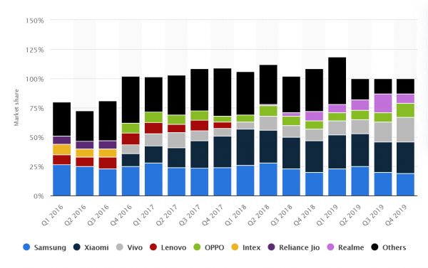 印度手机市场份额(2016年Q1至2019年Q4)/Statista 2020