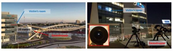 窃听装置(位于人行天桥上)与悬挂的LED灯泡(位于附近建筑第三层的办公室)之间的距离为25米。