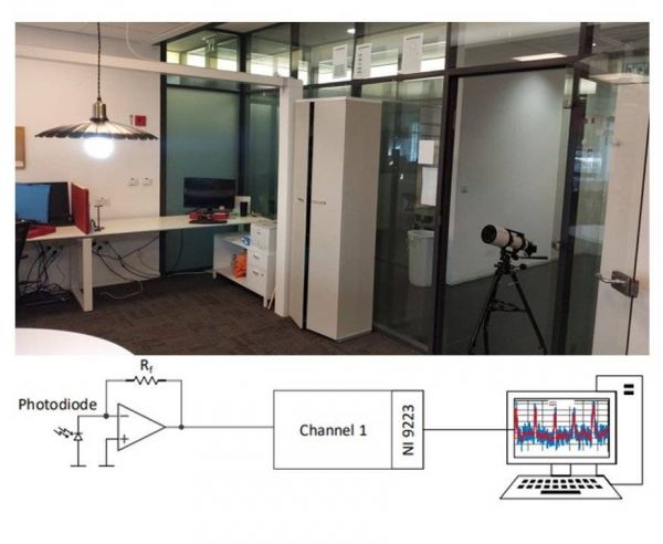 实验装置:望远镜指向LED灯泡(12瓦)。电光传感器(由一个光电二极管组成,将光转换成电压)被安装在望远镜上,其输出的电压通过采样并在LabVIEW软件中处理。所有的实验都是在一个关着门的房间里进行,以排除其他影响因素。