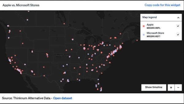 Thinknum 就曾统计过,北美地区 274 家苹果商店与 85 家微软商店的选址重合度,最后的统计结果令人惊讶。每一家微软商店一英里之内就有一家苹果商店,在 85 家微软商店中恰好有 82 家与苹果商店距离不到一英里,有 75 家距离不到 0.5 英里。特别是在纽约、多伦多等大型购物中心,微软商店与苹果商店往往就隔着一条街,距离不足 0.25 英里。