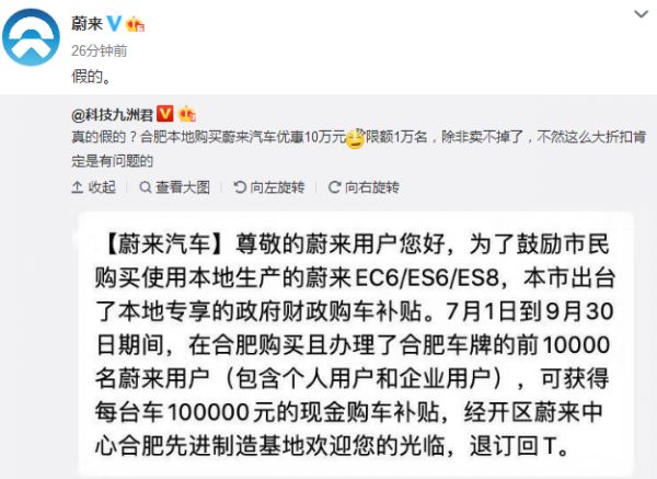 6月30日,有网友微博曝出在合肥购买且办理合肥车牌的前10000名蔚来用户,可获得每台车10万元现金购车补贴的消息。蔚来汽车官方微博回应称此消息系假消息。