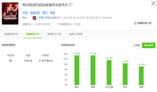 而“天时地利人和”之下,姐姐们的直播带货首秀没有冲出想象中的巨浪。飞瓜数据显示,该直播共上架28件商品,销售额为371.9万元。
