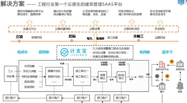 一般情况下,工程项目从开工到结束包括立项、预算、中标、施工+过程结算,最后是运营。计支宝主要覆盖施工+过程结算为主,与甲方项目资金深度绑定,再通过结算资金接入到其他业务系统和服务中。