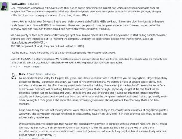 但是在美国本土员工对 H1B 政策的愤怒却更能说明多数科技公司力挺工签政策的真实心态。在 《圣何塞信使报》一篇名为 “硅谷激烈批评特朗普周一的签证禁令” 的报道下面,湾区本地人对科技公司的自私利己发起了猛攻,一些坚定反对现任总统的人甚至在这件事上开始站台特朗普。