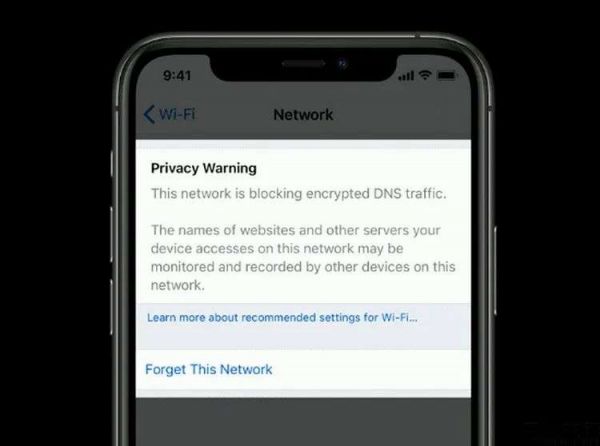 不仅如此,从苹果方面公布的一份系统截图来看,新的iOS系统甚至会自动检测加密DNS服务器的可用性。如果用户当前所连接到的网络恶意屏蔽了对加密DNS服务器的连接,则系统会自动弹出警告,并告知使用者存在信息泄露的风险。