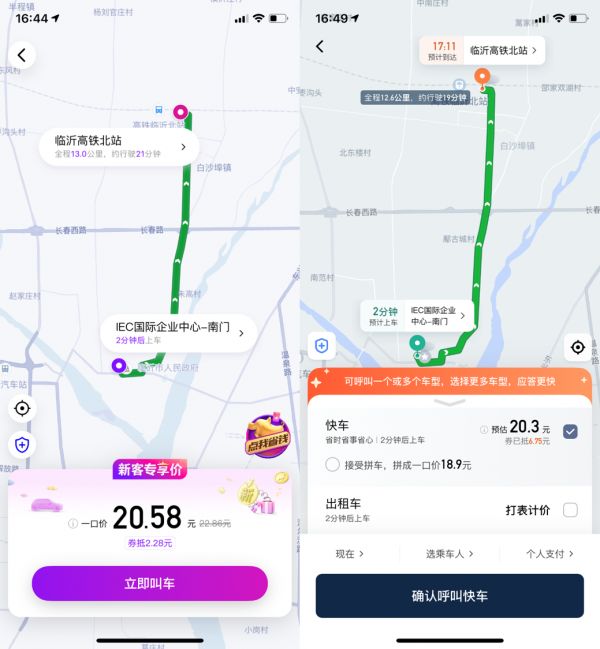 燃财经在6月底测试发现,在临沂市打车,15公里以内,花小猪跟滴滴价格差别不大,100公里以上的长途,价格相差30元以上。