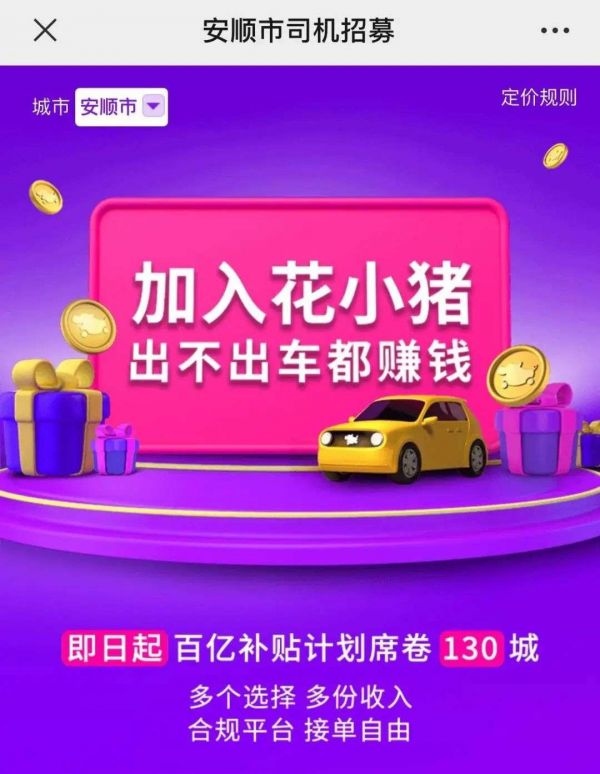 在山东临沂和贵州遵义,一个今年刚上线不久、叫做“花小猪”的网约车平台,打着“全网最低价”的旗号,上线不久就抢走了当地不少快车订单。它主攻下沉市场,主打一口价模式,“便宜”是最大标签。它在宣传材料里称,正计划在全国130个城市推行“百亿补贴”。