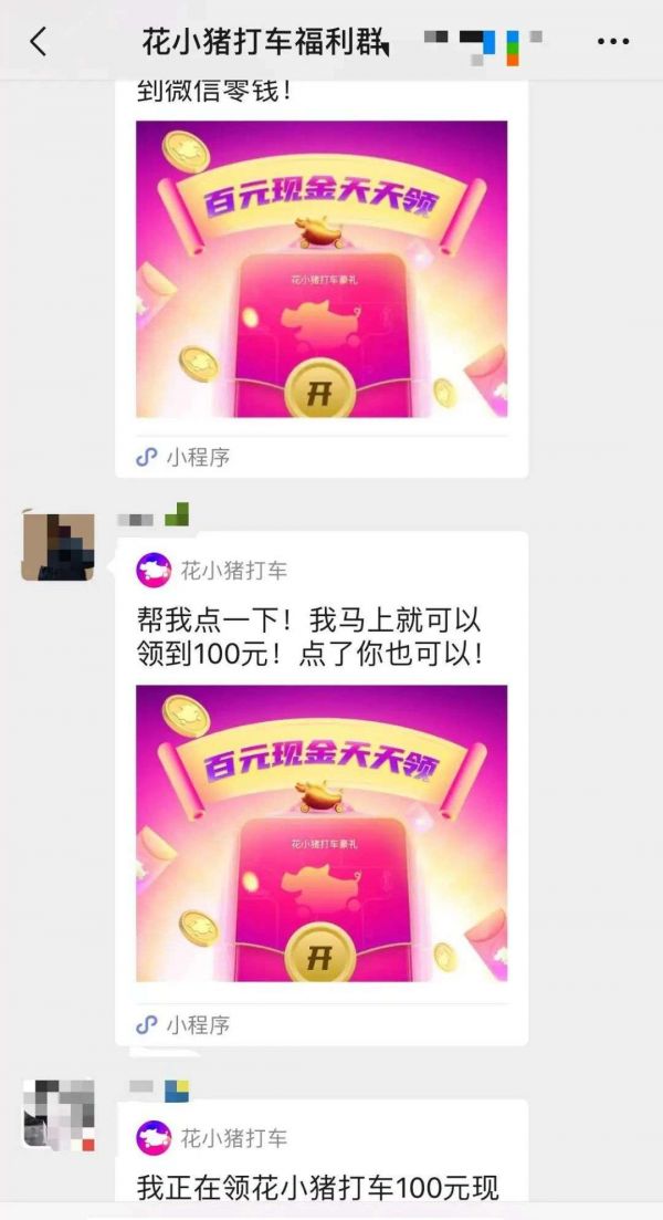 花小猪的运营人员成立了“打车福利群”,用户在里边刷屏似的分享红包链接,大家通过互点,以及不停拉新用户入群,来达到取现资格。