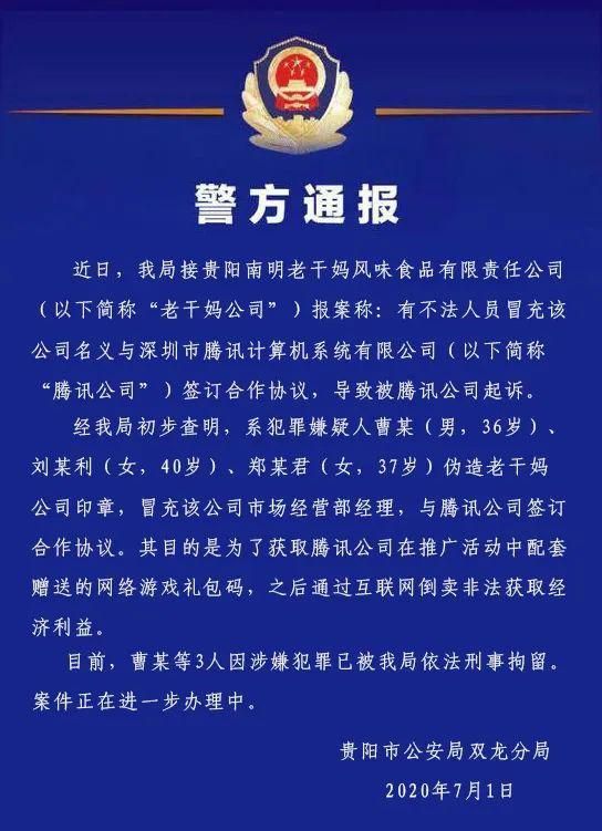 贵阳警方通报,3人伪造老干妈印章与腾讯签订合同,已被刑拘;此前,腾讯状告老干妈欠广告费,老干妈称腾讯遭遇诈骗。