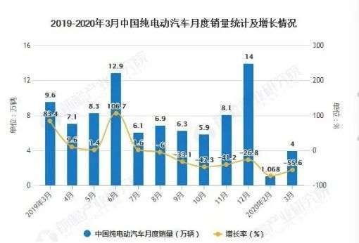2019年~2020年3月中国纯电动汽车月销量统计,图源前瞻产业研究院