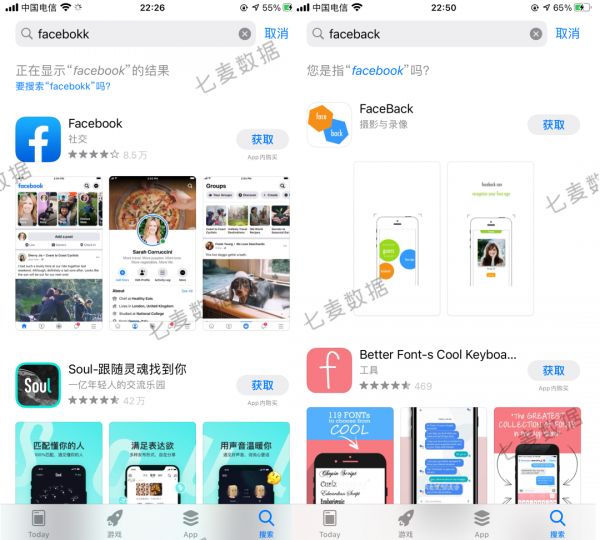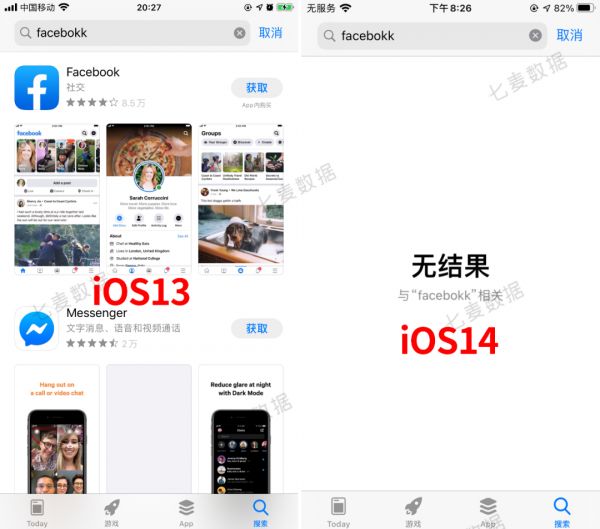除此之外,我们发现如果不想搜索苹果“自动纠错”的词,而是直接点击下方的提示“要搜索 xxx 吗?,显示的搜索结果会和 iOS13系统不一样。比如搜索 facebokk,会自动纠正成 facebook,如果坚持选择搜索 facebokk,出来的搜索结果会和 iOS13 系统不一样。
