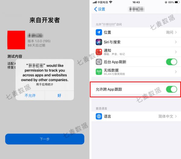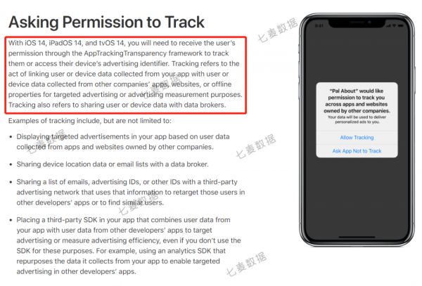 也就是说以后应用需要向用户请求权限,才能跨应用和网站跟踪用户信息。如果用户拒绝授予应用对设备 IDFA 的访问权限,则相当于他已启用了“限制广告跟踪”。