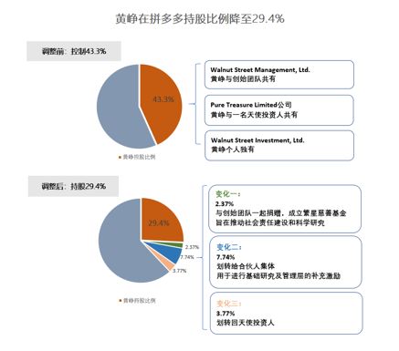 此前,由黄峥控制的43.3%的股份主要由三部分构成,大部分是黄峥自己持股,一部分是通过Pure Treasure Limited公司持股,一部分是通过Walnut Street Management, Ltd.公司持有。后面这两家公司均由黄峥控制,但都有小股东。其中,Pure Treasure Limited公司为黄峥与一位天使投资人共同拥有;Walnut Street Management, Ltd.公司为黄峥与创始团队共同拥有。