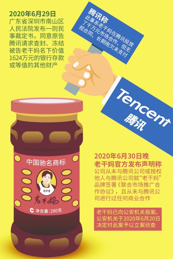 对此,腾讯方面6月30日对外称,此事系老干妈在腾讯投放了千万元市场合作,但无视合同长期拖欠未付款。腾讯被迫依法起诉,申请资产保全,法院裁定冻结对方企业账户。