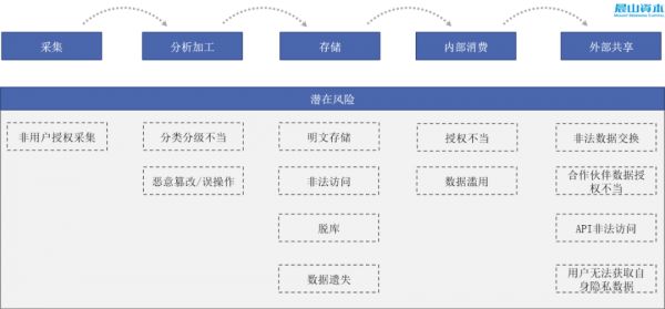 数据是信息时代最重要的生产资料。企业针对不同类型的数据往往有多个处理和加工环节,大体分类包括:数据采集、分析加工、存储、内部消费和外部共享等五步。企业采集的隐私数据在任何一个环节都面临着合规遵循的需求,以及内外部原因带来的数据泄露的安全威胁。