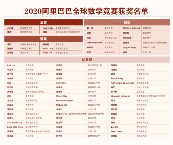 阿里巴巴全球数学竞赛( Alibaba Global Mathematics Competition)由中国科学技术协会、阿里巴巴基金会、阿里巴巴达摩院共同举办,今年赛事吸引了海内外七十多个国家和地区的报名者。“最强73人”包括4名金奖选手、6名银奖选手、12名铜奖选手和51名优秀奖选手,他们来自8个国家,就读或毕业于33所高校。