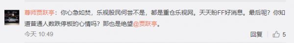 你贾跃亭拍拍屁股去美国豪宅过逍遥日子,我股民在家泡面就咸菜。你贾跃亭无视乐视网找你追债,我股民眼睁睁看着乐视网就此退市。你贾跃亭辗转腾挪也不知道使了啥把戏金蝉脱壳,我股民的补偿就此被放在了丝毫看不见影的FF未来成功上。