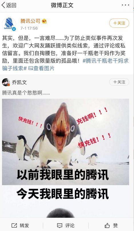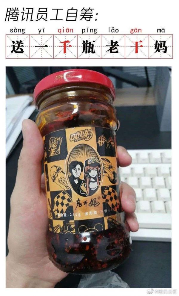 7月1日傍晚,腾讯公司官方微博回应“老干妈事件”,称一言难尽,并为了防止类似事件再次发生,以1000瓶老干妈为礼品征求类似线索。