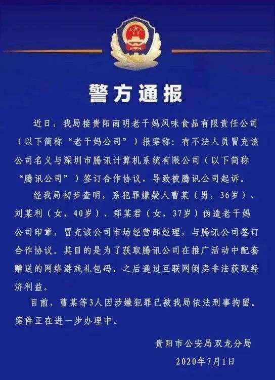 贵阳警方通报称,经初步查明:系犯罪嫌疑人曹某(男,36岁)、刘某利(女,40岁)、郑某君(女,37岁)伪造老干妈公司印章,冒充该公司市场经营部经理,与腾讯签订合作协议。其目的是为获取腾讯在推广活动中配套赠送的网络游戏礼包码,之后通过互联网倒卖非法获取经济利益。目前,曹某等3人因涉嫌犯罪已被依法刑事拘留。案件正在进一步办理中。