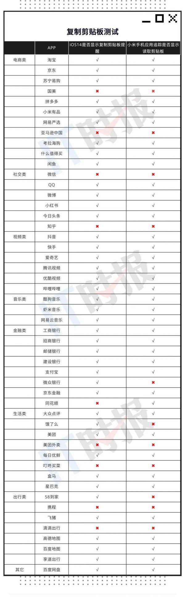 升级为iOS14测试版后,《IT时报》记者测试了50款主流App,覆盖电商、社交、视频、音乐、金融、生活、出行等领域,结果显示只有9款App没有触发复制剪贴板的提醒,分别是微信、国美、亚马逊中国、知乎、同花顺、美团外卖、叮咚买菜、携程和滴滴出行。