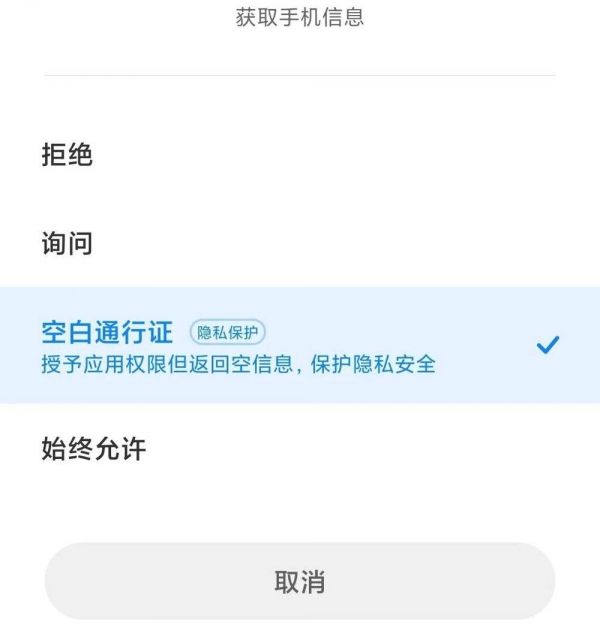 只要App调取用户个人信息,小米这一功能便会提醒,同时返回一个“空白通行证”,一定程度上解决了“不给权限不让用”的问题。