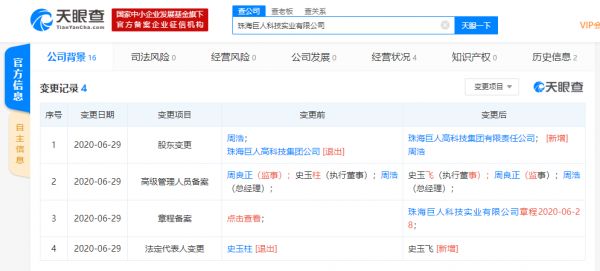 工商变更:史玉柱卸任珠海巨人科技实业有限公司法定代表人、执行董事