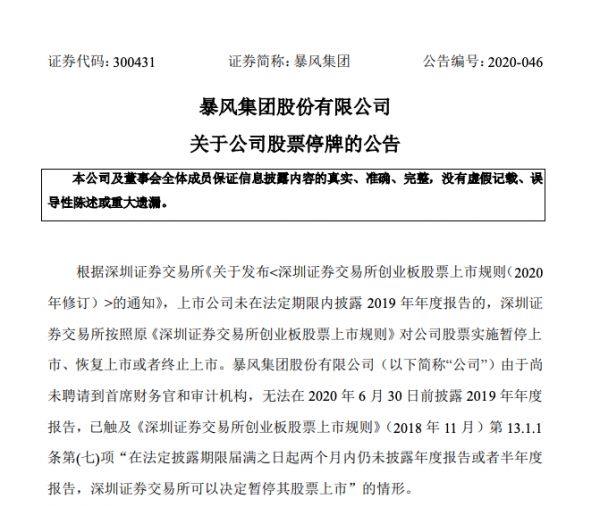 7月1日,暴风开始停牌。早在前一天晚上,暴风集团对外发布公告称,因尚未聘请到首席财务官和审计机构,无法在2020年6月30日前披露2019年年度报告。换句话说,接下来的15天里,暴风将决定是否退市。