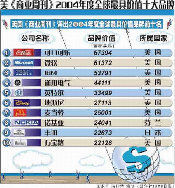 美国杂志《商业周刊》2004年度全球最具价值十大品牌中,微软以61372百万美元的品牌价值排名第二。同年10月出版的美国《软件杂志》,也公布了全球软件业500强,这些企业的总收入增长了14%以上,IBM和微软名列前两位。
