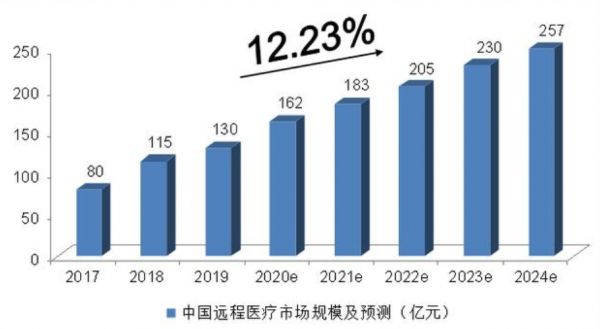 根据中投公司的数据显示,2017年,我国的远程医疗市场尚且仅有79.8亿元的规模。但是在历经疫情的考验之后,这一数字今年或可达到162亿元。而在2024年,我国的远程医疗将触及250+亿元的市场规模。年复合增长率达到12.23%。