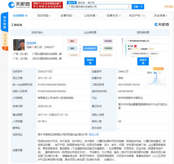 广西叫酒网络科技有限公司成立于2017年1月,法定代表人为陈柏桦,公司经营范围包括;配送服务(不含道路货物运输及快递服务);批发兼零售:日用百货、食品等,天眼查股东信息显示,该公司工商披露的股东中,黎永新为公司最大股东,持股比例为62.23%,深圳市腾讯创业创新发展有限公司则持股2.50%。