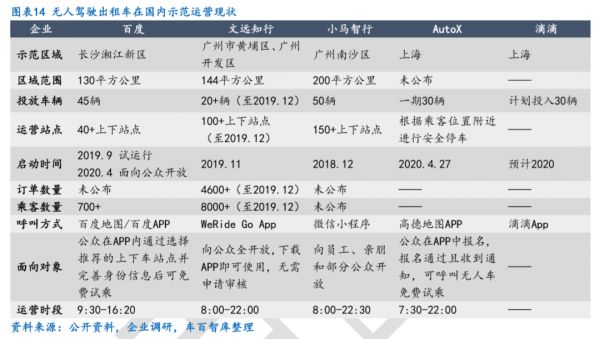 据车百智库整理(截至4月)发现,百度、文远知行、AutoX等走在了Robotaxi商业化的前端,其中百度甚至已面向公众开放;滴滴进入较晚,且仍处于种子用户招募阶段。