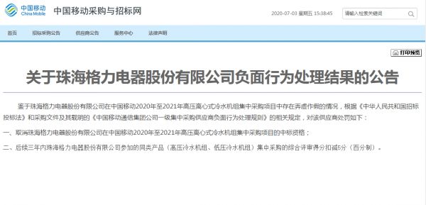 格力电器“弄虚作假”!中国移动取消其中标资格