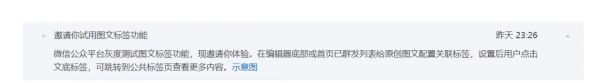 昨晚深夜11点半,晓程序观察(yingoo-tech)收到了来自官方的邀请,试用「图文标签」功能,简单的说就是公众号图文终于可以打标签了!